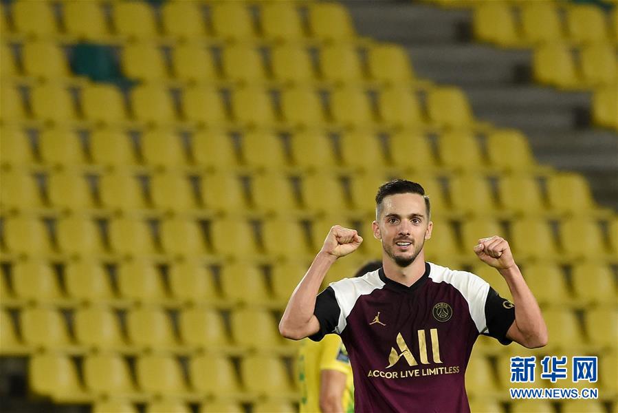 10月31日,巴黎圣日耳曼队球员萨拉维亚在进球后庆祝。 当日,在2020-2021赛季法国足球甲级联赛第九轮比赛中,巴黎圣日耳曼队客场以3比0战胜南特队。 新华社/法新