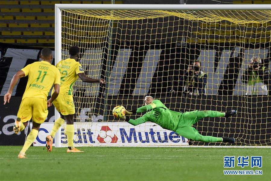 10月31日,巴黎圣日耳曼队守门员纳瓦斯(右)在比赛中扑救。 当日,在2020-2021赛季法国足球甲级联赛第九轮比赛中,巴黎圣日耳曼队客场以3比0战胜南特队。 新华社/法新