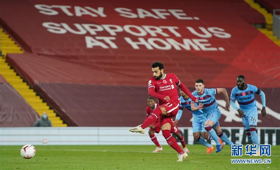 10月31日,利物浦队球员萨拉赫(前)在比赛中主罚点球命中。 当日,在2020-2021赛季英格兰足球超级联赛第七轮比赛中,利物浦队主场以2比1战胜西汉姆联队。 新华社/路透