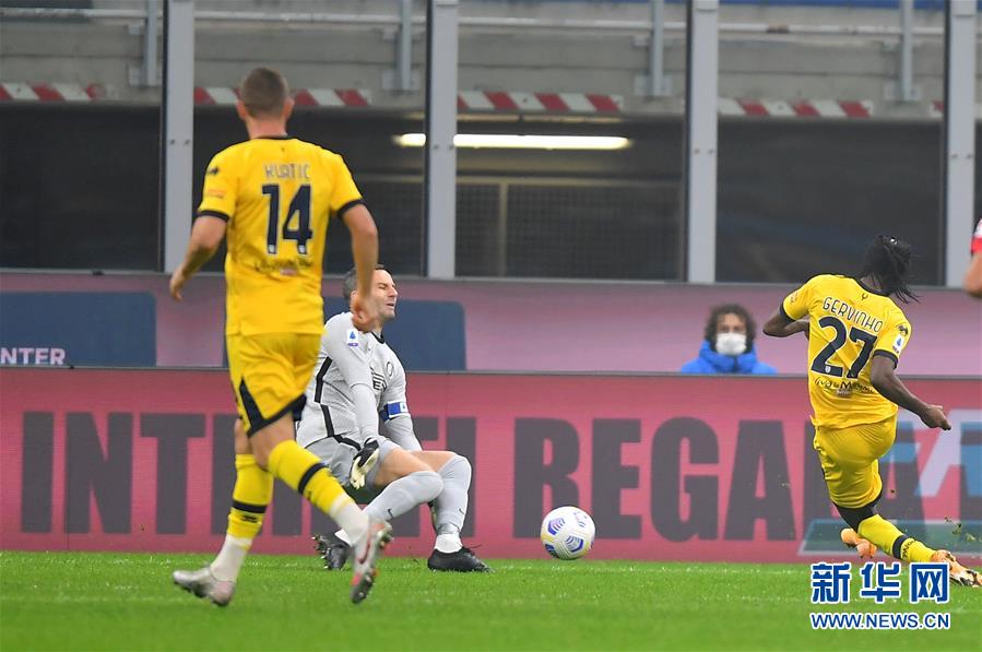 10月31日,帕尔马队球员热尔维尼奥(右一)在比赛中打进第二粒进球。 当日,在2020-2021赛季意大利足球甲级联赛第六轮比赛中,国际米兰队主场以2比2战平帕尔马队。 新华社发(达尼埃莱·马斯科洛摄)
