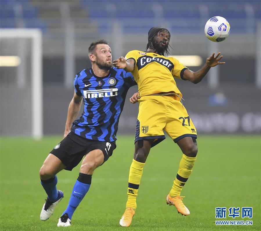 10月31日,国际米兰队球员德弗赖(左)与帕尔马队球员热尔维尼奥在比赛中拼抢。 当日,在2020-2021赛季意大利足球甲级联赛第六轮比赛中,国际米兰队主场以2比2战平帕尔马队。 新华社发(达尼埃莱·马斯科洛摄)