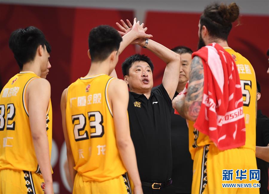 11月1日,浙江广厦控股队主教练李春江在场边指导。 当日,在浙江诸暨举行的2020-2021中国男子篮球职业联赛(CBA)第一阶段比赛中,浙江广厦控股队以97比96战胜四川五粮金樽队。新华社记者 沙达提 摄