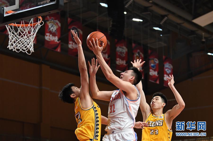 11月1日,四川五粮金樽队球员陈辰(中)在比赛中突破上篮。 当日,在浙江诸暨举行的2020-2021中国男子篮球职业联赛(CBA)第一阶段比赛中,浙江广厦控股队以97比96战胜四川五粮金樽队。新华社记者 沙达提 摄