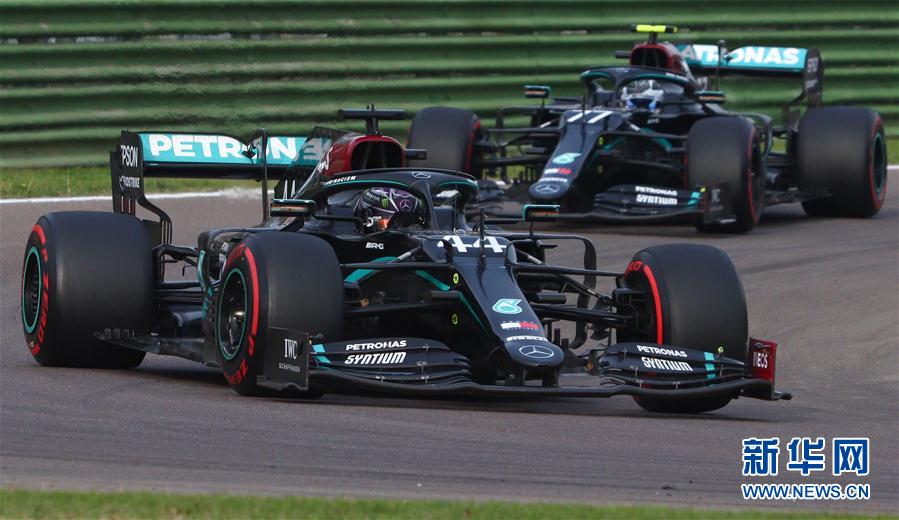 11月1日,梅赛德斯车队英国车手汉密尔顿(前)在比赛中。 当日,在意大利伊莫拉赛道举行的2020赛季世界一级方程式锦标赛(F1)艾米利亚-罗马涅大奖赛中,梅赛德斯车队英国车手汉密尔顿以1小时28分32秒430的成绩夺得冠军,队友芬兰车手博塔斯获得亚军。雷诺车队澳大利亚车手里卡尔多获得季军。 新华社/法新