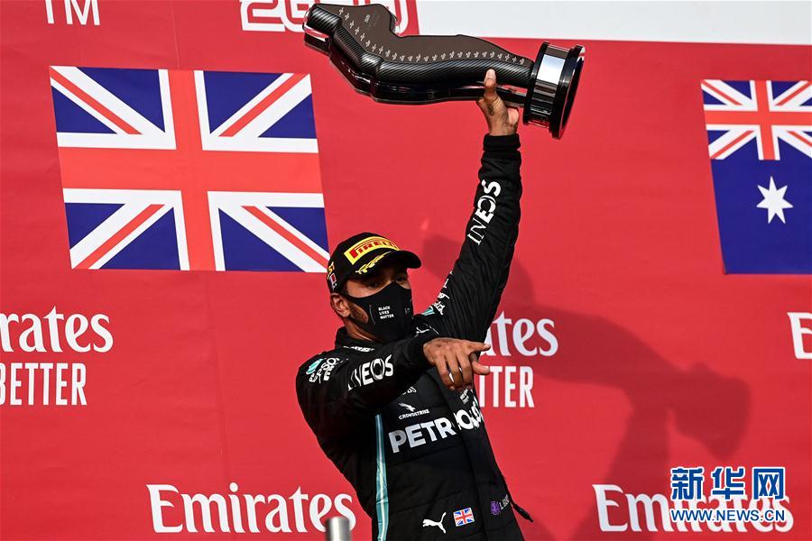 11月1日,梅赛德斯车队英国车手汉密尔顿在领奖台上庆祝。 当日,在意大利伊莫拉赛道举行的2020赛季世界一级方程式锦标赛(F1)艾米利亚-罗马涅大奖赛中,梅赛德斯车队英国车手汉密尔顿以1小时28分32秒430的成绩夺得冠军,队友芬兰车手博塔斯获得亚军。雷诺车队澳大利亚车手里卡尔多获得季军。 新华社/法新