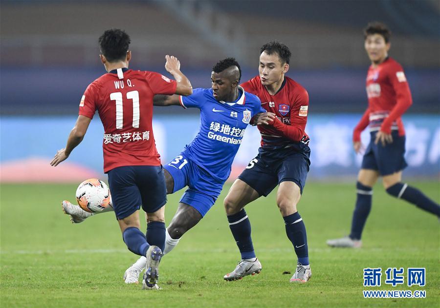 11月1日,上海绿地申花队球员博拉尼奥斯(左二)在比赛中带球突破。 当日,在2020赛季中国足球协会超级联赛(苏州赛区)第18轮比赛中,重庆当代队与上海绿地申花队在常规时间和加时赛中战成2比0,总比分3比3战平。最终通过点球大战,重庆当代队以12比9(点球10比9)战胜上海绿地申花队,从而以两回合总比分13比12晋级第五名争夺赛。 新华社记者 许畅 摄