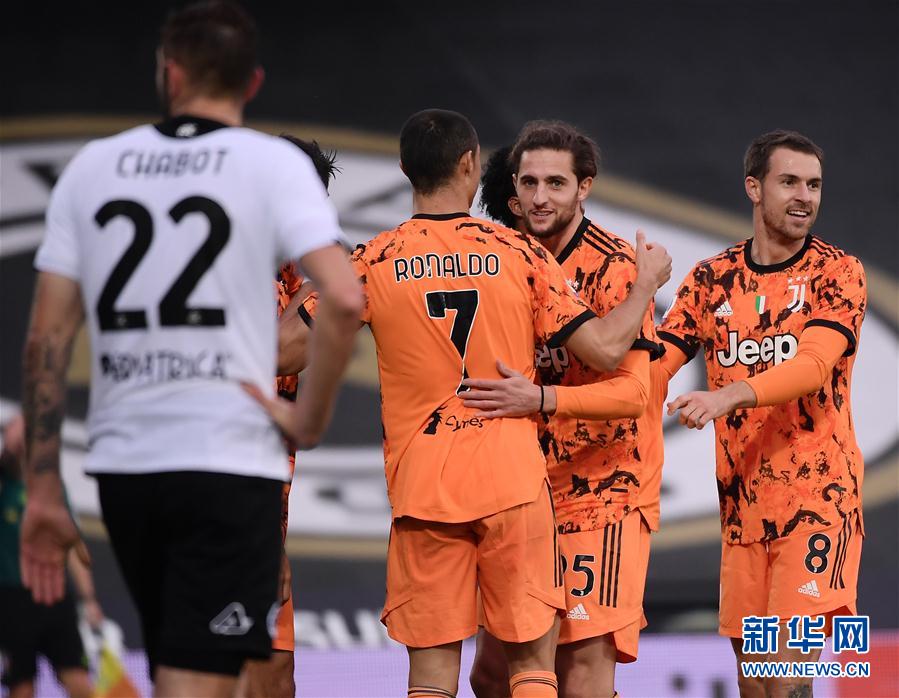11月1日,尤文图斯队球员拉比奥(右二)进球后与克·罗纳尔多庆祝。 当日,在2020-2021赛季意大利足球甲级联赛第六轮比赛中,尤文图斯队客场以4比1战胜斯佩齐亚队。 新华社发(费代里科·塔尔迪托 摄)