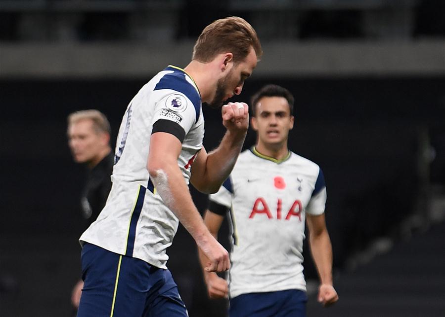 11月1日,热刺队球员凯恩(前)庆祝进球。 当日,在2020-2021赛季英格兰足球超级联赛第七轮比赛中,托特纳姆热刺队主场以2比1战胜布莱顿队。 新华社/路透