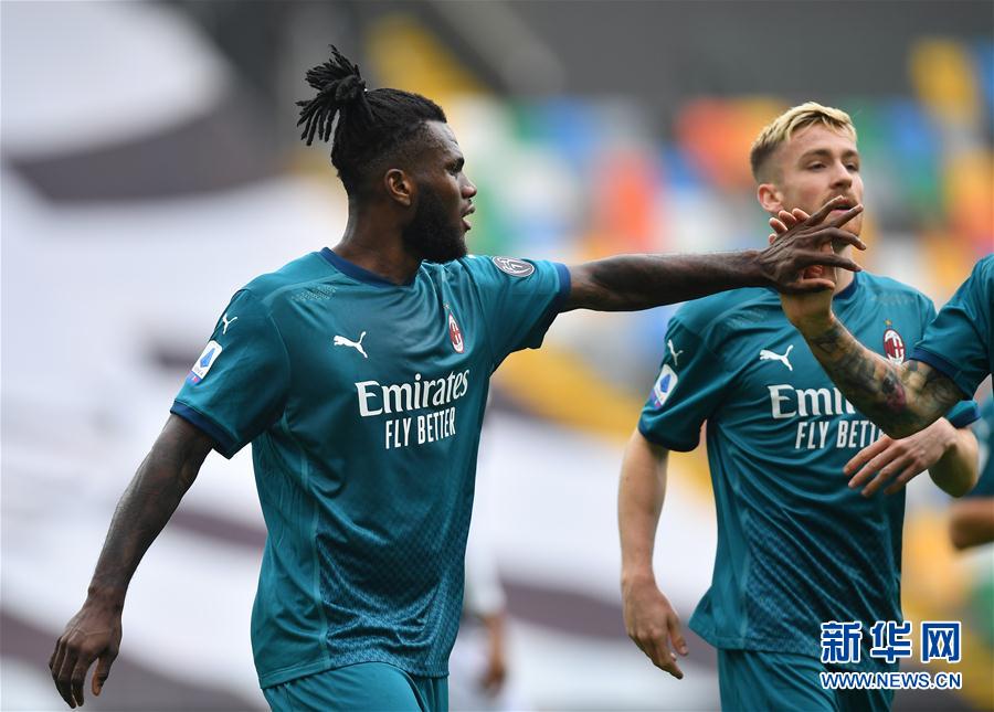 11月1日,AC米兰队球员凯西(左)在比赛中庆祝进球。 当日,在2020-2021赛季意大利足球甲级联赛第六轮比赛中,AC米兰队客场以2比1战胜乌迪内斯队。 新华社发(阿尔贝托·林格利亚 摄)