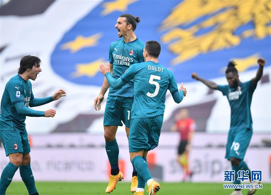 11月1日,AC米兰队球员伊布拉希莫维奇(左二)在比赛中庆祝进球。 当日,在2020-2021赛季意大利足球甲级联赛第六轮比赛中,AC米兰队客场以2比1战胜乌迪内斯队。 新华社发(阿尔贝托·林格利亚 摄)