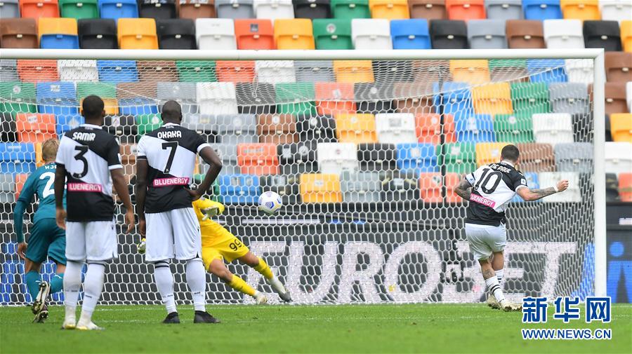11月1日,乌迪内斯队球员德保罗(右一)在比赛中主罚点球得分。 当日,在2020-2021赛季意大利足球甲级联赛第六轮比赛中,AC米兰队客场以2比1战胜乌迪内斯队。 新华社发(阿尔贝托·林格利亚 摄)