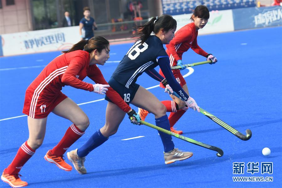 11月2日,内蒙古队球员马雪妍(中)在比赛中带球进攻。 当日,在江苏常州举行的2020年全国女子曲棍球锦标赛第一阶段比赛中,吉林队以3比0战胜内蒙古队。 新华社发(史康 摄)