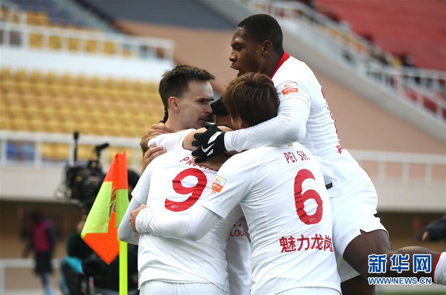 11月2日,深圳佳兆业队球员在比赛中庆祝进球。 当日,在2020赛季中国足球协会超级联赛(大连赛区)第18轮比赛中,深圳佳兆业队以2比2战平石家庄永昌队。最终,深圳佳兆业队以两轮总比分3比2战胜石家庄永昌队,保级成功。 新华社记者 姚剑锋 摄