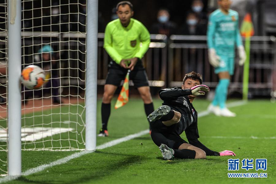 11月2日,青岛黄海青港队门将刘震理在点球大战中做出扑救动作,第一个主罚点球的武汉卓尔队球员姚翰林将皮球打在门柱上。 当日,在2020赛季中国足球协会超级联赛(大连赛区)第18轮比赛中,青岛黄海青港队以2比1战胜武汉卓尔队,双方两轮总比分3比3战平进入加时赛,两队在加时赛均未取得进球。最终,青岛黄海青港队在点球大战中以5比4战胜武汉卓尔队,保级成功。 新华社记者 潘昱龙 摄