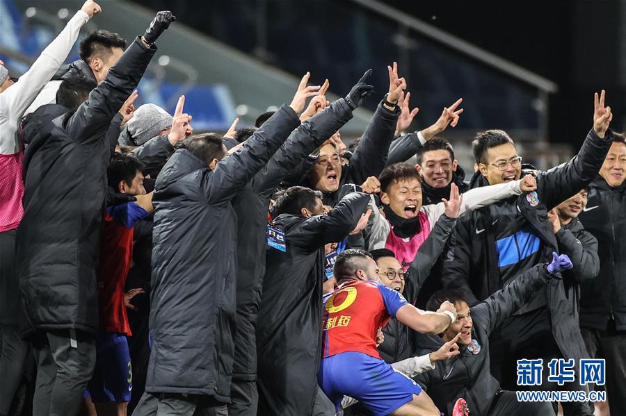 11月2日,青岛黄海青港队成员在保级成功后庆祝。 当日,在2020赛季中国足球协会超级联赛(大连赛区)第18轮比赛中,青岛黄海青港队以2比1战胜武汉卓尔队,双方两轮总比分3比3战平进入加时赛,两队在加时赛均未取得进球。最终,青岛黄海青港队在点球大战中以5比4战胜武汉卓尔队,保级成功。 新华社记者 潘昱龙 摄