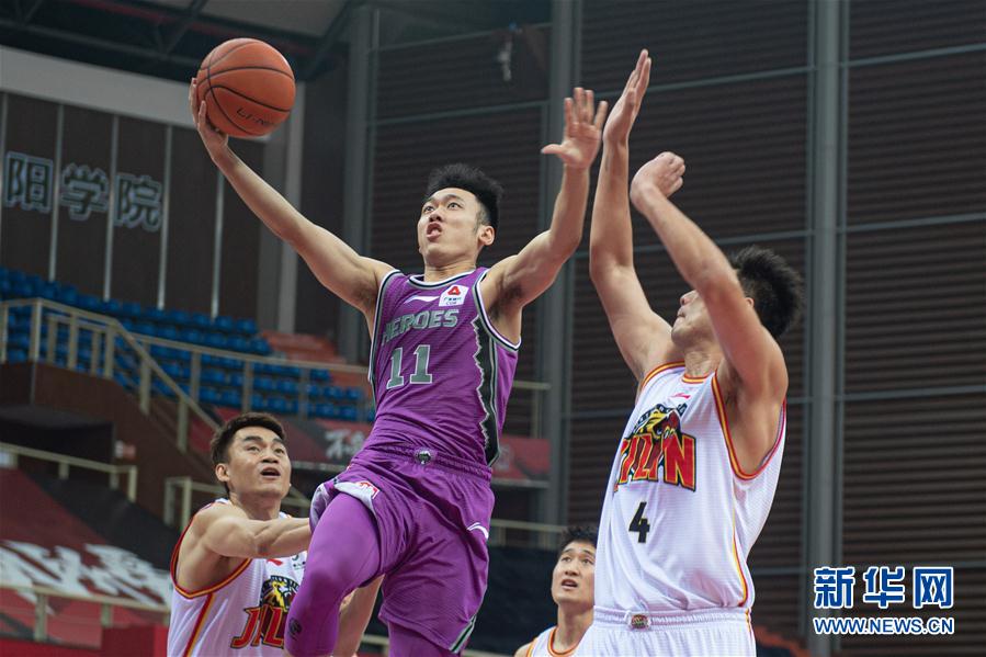 11月2日,山东西王队球员王文宇(中)在比赛中上篮。 当日,在浙江诸暨举行的2020-2021赛季中国男子篮球职业联赛(CBA)第一阶段第七轮比赛中,山东西王队以106比93战胜九台农商银行队。 新华社发(江汉摄)