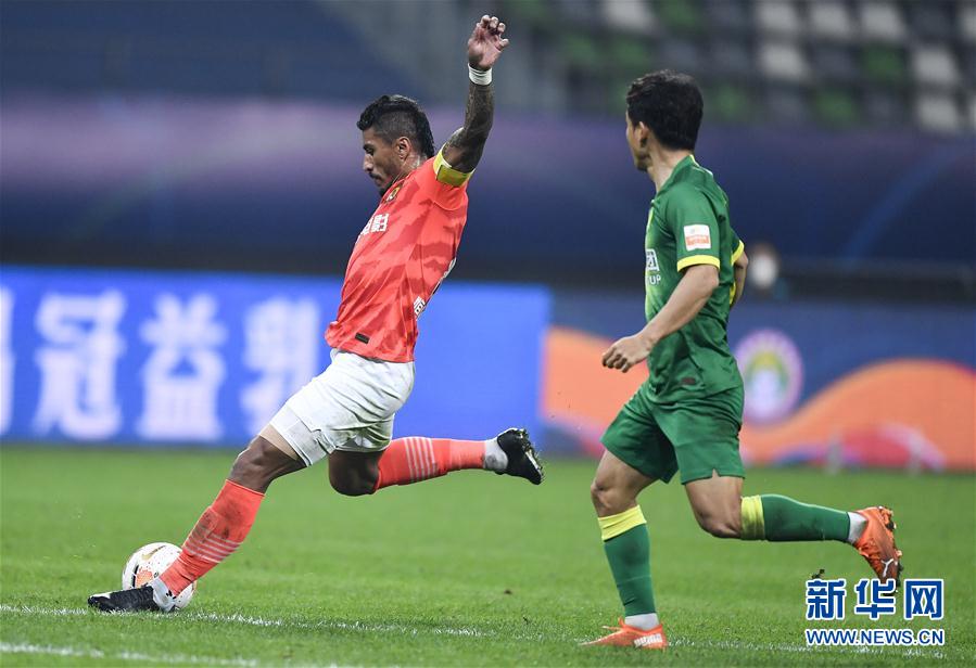 11月2日,广州恒大淘宝队球员保利尼奥(左)在比赛中破门得分。 当日,在2020赛季中国足球协会超级联赛(苏州赛区)第18轮比赛中,广州恒大淘宝队以3比1战胜北京中赫国安队,从而以两回合总比分3比1晋级决赛。 新华社记者 许畅 摄
