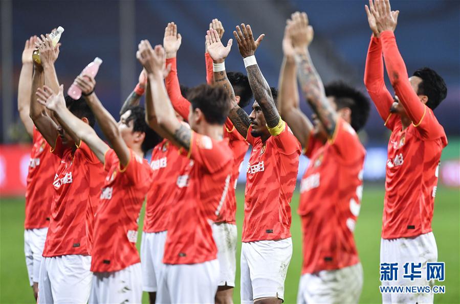 11月2日,广州恒大淘宝队球员保利尼奥(右三)与队友在赛后向到场观众致意。 当日,在2020赛季中国足球协会超级联赛(苏州赛区)第18轮比赛中,广州恒大淘宝队以3比1战胜北京中赫国安队,从而以两回合总比分3比1晋级决赛。 新华社记者 许畅 摄