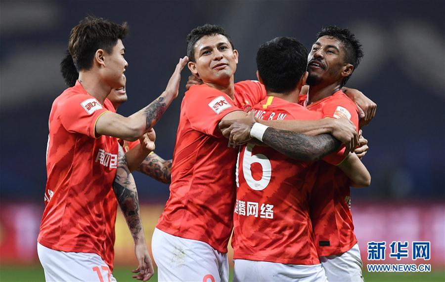 11月2日,广州恒大淘宝队球员保利尼奥(右一)在比赛中进球后与队友庆祝。 当日,在2020赛季中国足球协会超级联赛(苏州赛区)第18轮比赛中,广州恒大淘宝队以3比1战胜北京中赫国安队,从而以两回合总比分3比1晋级决赛。 新华社记者 许畅 摄