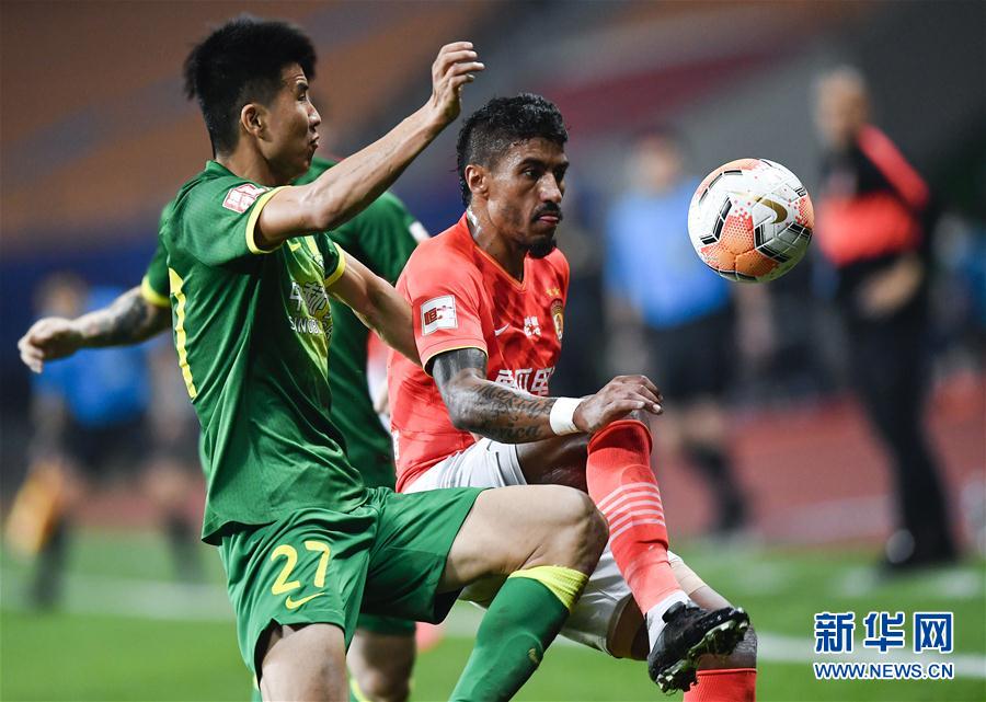 11月2日,广州恒大淘宝队球员保利尼奥(右)与北京中赫国安队球员王刚在比赛中拼抢。 当日,在2020赛季中国足球协会超级联赛(苏州赛区)第18轮比赛中,广州恒大淘宝队以3比1战胜北京中赫国安队,从而以两回合总比分3比1晋级决赛。 新华社记者 许畅 摄