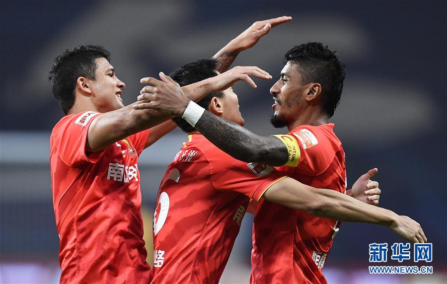 11月2日,广州恒大淘宝队球员保利尼奥(右)在比赛中进球后与队友庆祝。 当日,在2020赛季中国足球协会超级联赛(苏州赛区)第18轮比赛中,广州恒大淘宝队以3比1战胜北京中赫国安队,从而以两回合总比分3比1晋级决赛。 新华社记者 许畅 摄