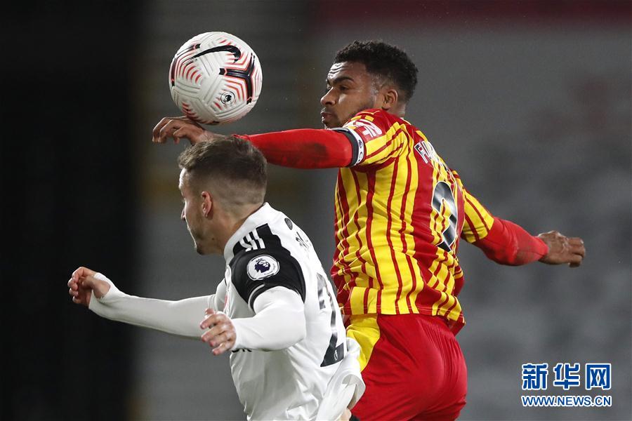 11月2日,富勒姆队球员布赖恩(左)与西布罗姆维奇队球员弗朗在比赛中争顶。 当日,在2020-2021赛季英格兰足球超级联赛第七轮比赛中,富勒姆队主场以2比0战胜西布罗姆维奇队。 新华社/路透