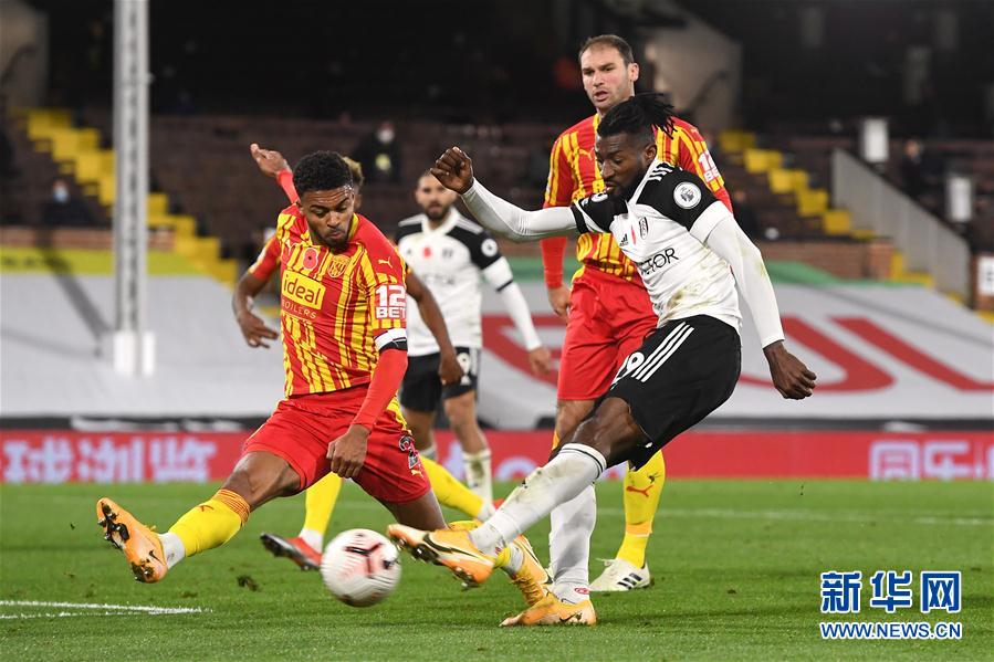11月2日,富勒姆队球员扎姆博(前右)在比赛中射门。 当日,在2020-2021赛季英格兰足球超级联赛第七轮比赛中,富勒姆队主场以2比0战胜西布罗姆维奇队。 新华社/路透