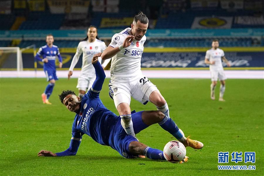 11月2日,莱斯特城队球员詹姆斯(下)在比赛中与利兹联队球员艾林拼抢。 当日,在2020-2021赛季英格兰足球超级联赛第七轮比赛中,莱斯特城队客场以4比1战胜利兹联队。 新华社/路透