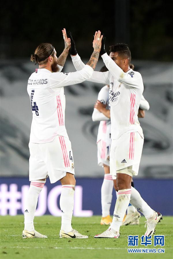 11月3日,皇家马德里队球员拉莫斯(左)在进球后和队友卡塞米罗庆祝。 当日,在马德里进行的2020-2021赛季欧冠联赛小组赛B组的一场比赛中,西甲皇家马德里队主场以3比2战胜意甲国际米兰队。 新华社发(爱德华·皮特斯摄)