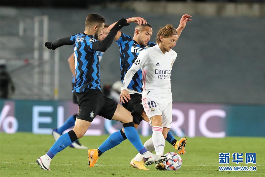 11月3日,皇家马德里队球员莫德里奇(右)在比赛中。 当日,在马德里进行的2020-2021赛季欧冠联赛小组赛B组的一场比赛中,西甲皇家马德里队主场以3比2战胜意甲国际米兰队。 新华社发(爱德华·皮特斯摄)