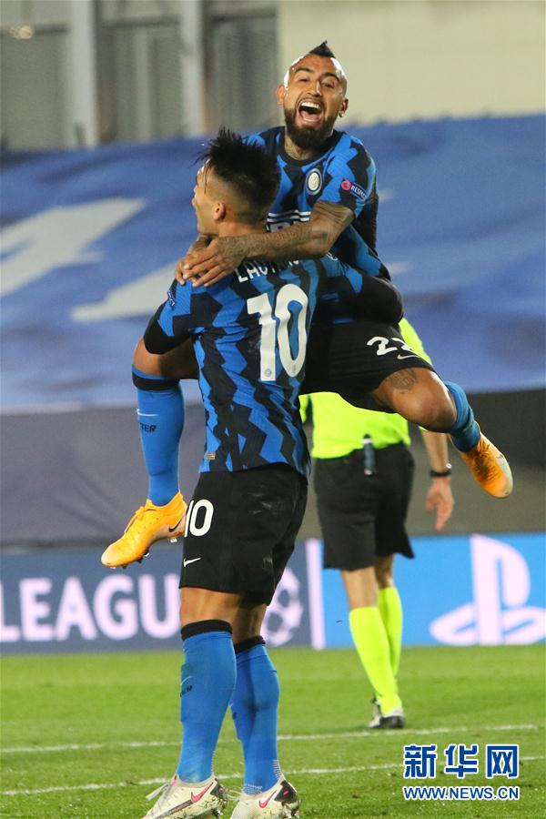 11月3日,国际米兰队球员劳塔罗(左)在进球后和队友比达尔庆祝。 当日,在马德里进行的2020-2021赛季欧冠联赛小组赛B组的一场比赛中,西甲皇家马德里队主场以3比2战胜意甲国际米兰队。 新华社发(爱德华·皮特斯摄)