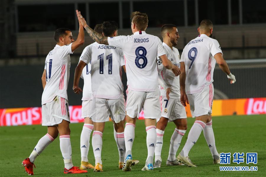 11月3日,皇家马德里队球员在比赛中庆祝进球。 当日,在马德里进行的2020-2021赛季欧冠联赛小组赛B组的一场比赛中,西甲皇家马德里队主场以3比2战胜意甲国际米兰队。 新华社发(爱德华·皮特斯摄)