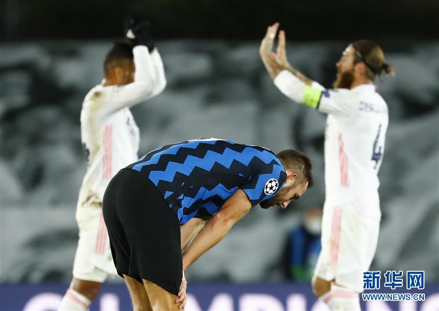 11月3日,国际米兰队球员德弗赖(前)在比赛后神情沮丧。 当日,在马德里进行的2020-2021赛季欧冠联赛小组赛B组的一场比赛中,西甲皇家马德里队主场以3比2战胜意甲国际米兰队。 新华社/路透