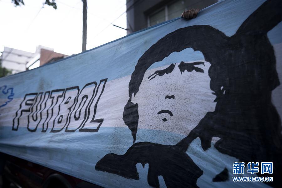 11月3日,在布宜诺斯艾利斯省维森特·洛佩斯,球迷举着印有马拉多纳画像的横幅为他加油。 当日,阿根廷“球王”迭戈·马拉多纳的私人医生表示,由于在颅内检测出了血肿,马拉多纳在当晚进行紧急手术。 新华社发(马丁·萨巴拉摄)
