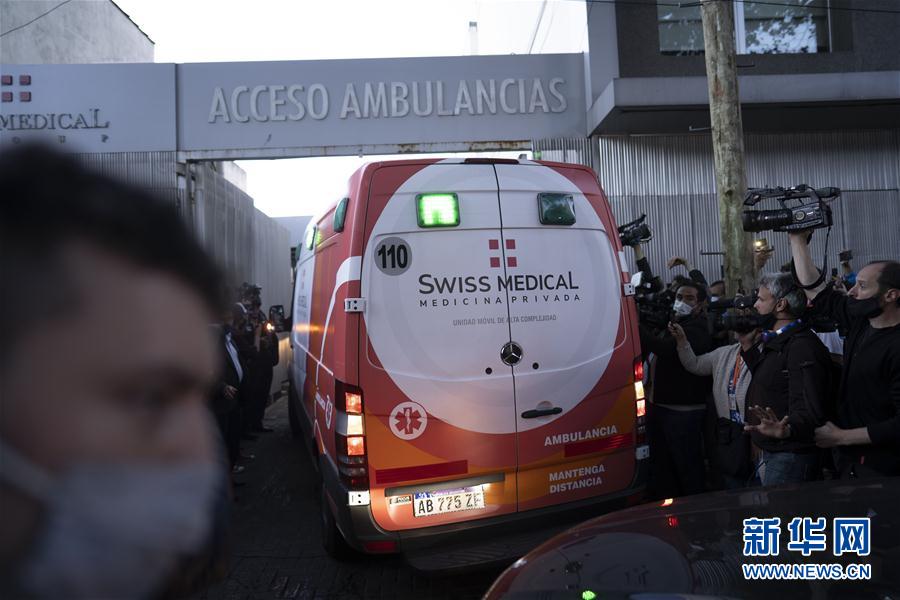 11月3日,一辆救护车将马拉多纳运送至布宜诺斯艾利斯省维森特·洛佩斯的一家诊所。 当日,阿根廷“球王”迭戈·马拉多纳的私人医生表示,由于在颅内检测出了血肿,马拉多纳在当晚进行紧急手术。 新华社发(马丁·萨巴拉摄)