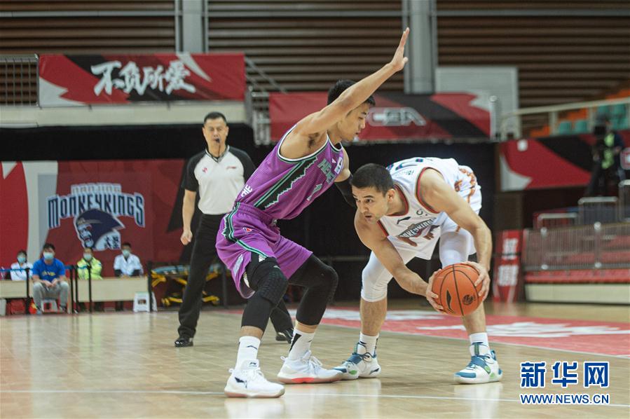 11月4日,山东西王队球员高诗岩(前左)在比赛中防守南京同曦宙光队球员西热力江。 当日,在浙江诸暨举行的2020-2021赛季中国男子篮球职业联赛(CBA)第一阶段第八轮比赛中,南京同曦宙光队以96比114不敌山东西王队。 新华社发(江汉摄)