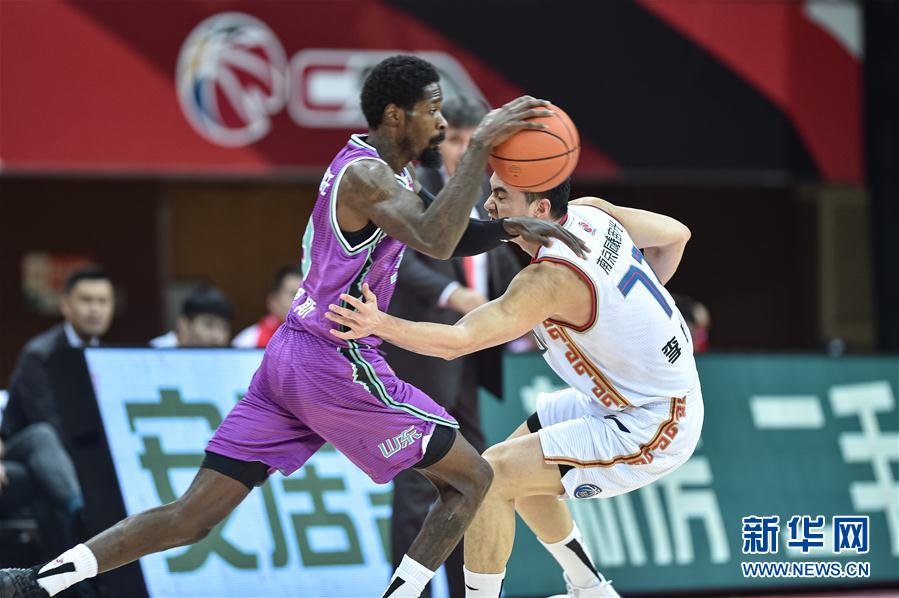 11月4日,南京同曦宙光队球员李盛东(右)在比赛中阻挡山东西王队球员哈里斯的快攻。 当日,在浙江诸暨举行的2020-2021赛季中国男子篮球职业联赛(CBA)第一阶段第八轮比赛中,南京同曦宙光队以96比114不敌山东西王队。 新华社发(江汉摄)