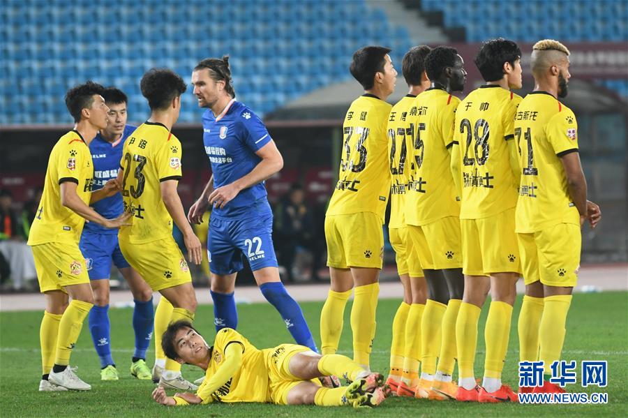 11月4日,内蒙古中优队球员周正(下)在比赛中准备防守对方任意球。 当日,在2020中国足球协会甲级联赛第二阶段(常州赛区)第四轮比赛中,江西联盛队以2比2战平内蒙古中优队。 新华社发(史康摄)