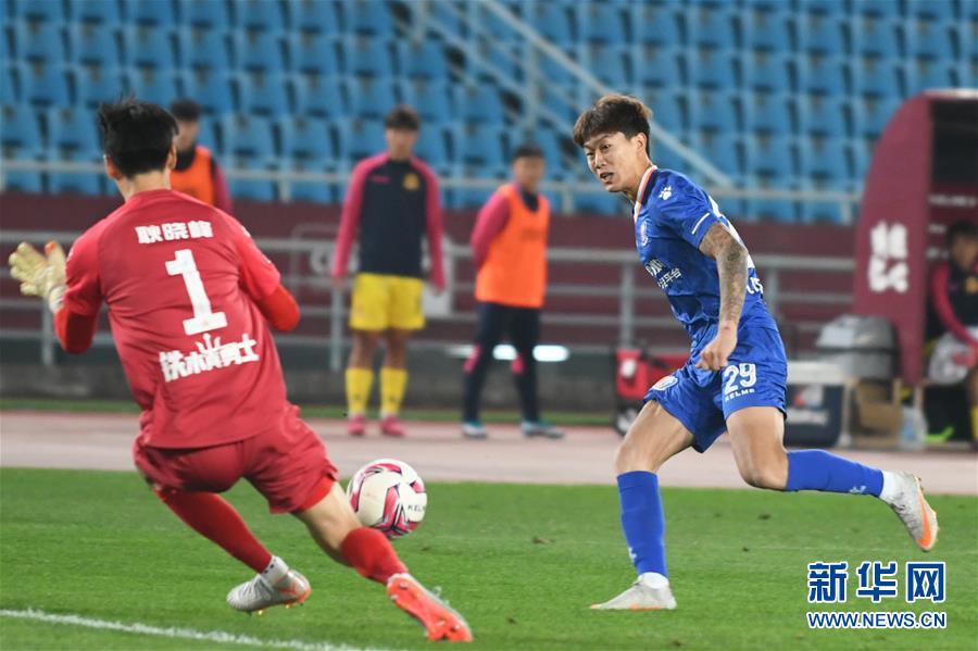 11月4日,江西联盛队球员阎格(右)在比赛中射门。 当日,在2020中国足球协会甲级联赛第二阶段(常州赛区)第四轮比赛中,江西联盛队以2比2战平内蒙古中优队。 新华社发(史康摄)