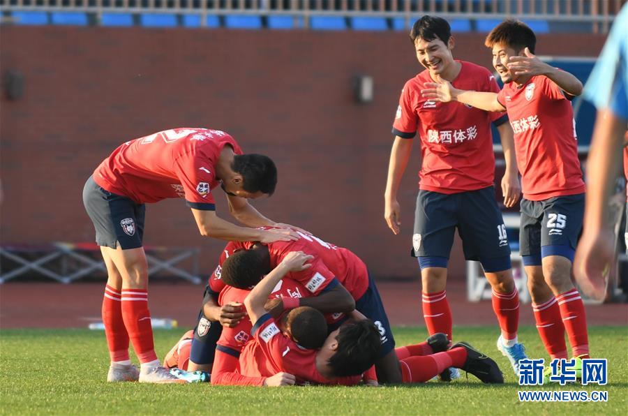 新华社照片,常州(江苏),2020年11月4日 #(体育)(3)足球——中甲:陕西大秦之水胜南通支云 11月4日,陕西大秦之水队球员在比赛中庆祝进球。 当日,在2020中国足球协会甲级联赛第二阶段(常州赛区)第四轮比赛中,陕西大秦之水队1比0战胜南通支云队。 新华社发(史康摄)