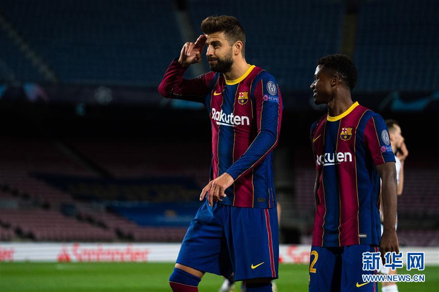 11月4日,巴塞罗那队球员皮克(左)在比赛中庆祝进球。 当日,在2020-2021赛季欧冠联赛小组赛G组第三轮比赛中,西甲巴塞罗那队主场以2比1战胜乌克兰基辅迪纳摩队。 新华社发(胡安·戈萨摄)