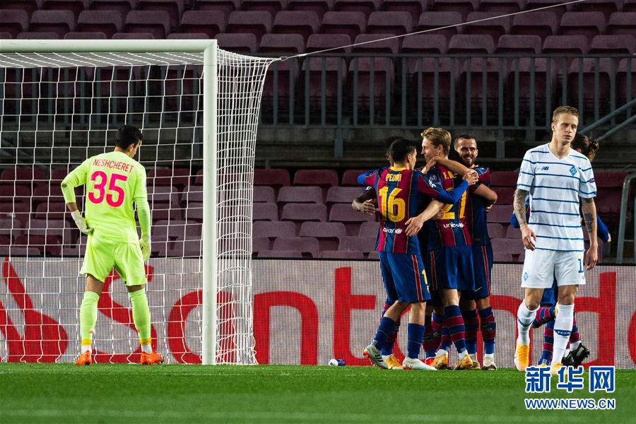 11月4日,巴塞罗那队球员在比赛中庆祝进球。 当日,在2020-2021赛季欧冠联赛小组赛G组第三轮比赛中,西甲巴塞罗那队主场以2比1战胜乌克兰基辅迪纳摩队。 新华社发(胡安·戈萨摄)