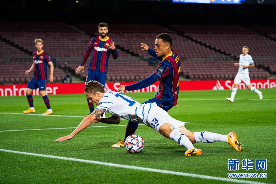 11月4日,巴塞罗那队球员德斯特(后)与基辅迪纳摩队球员沙巴诺夫在比赛中拼抢。 当日,在2020-2021赛季欧冠联赛小组赛G组第三轮比赛中,西甲巴塞罗那队主场以2比1战胜乌克兰基辅迪纳摩队。 新华社发(胡安·戈萨摄)