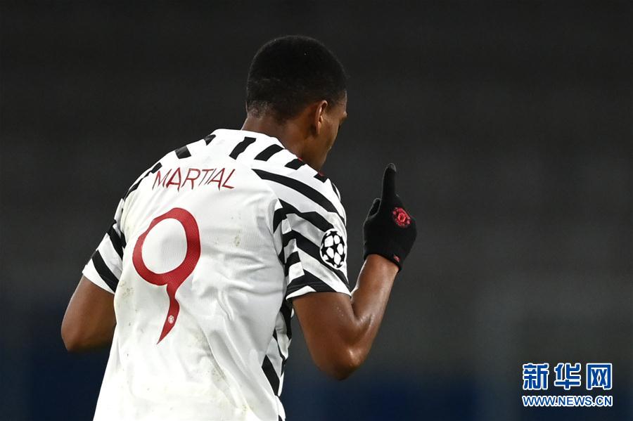 11月4日,曼联队球员马夏尔在比赛中庆祝进球。 当日,在2020-2021赛季欧洲足球冠军联赛H组小组赛第三轮比赛中,英超曼联队客场以1比2不敌土超伊斯坦布尔队。 新华社/法新