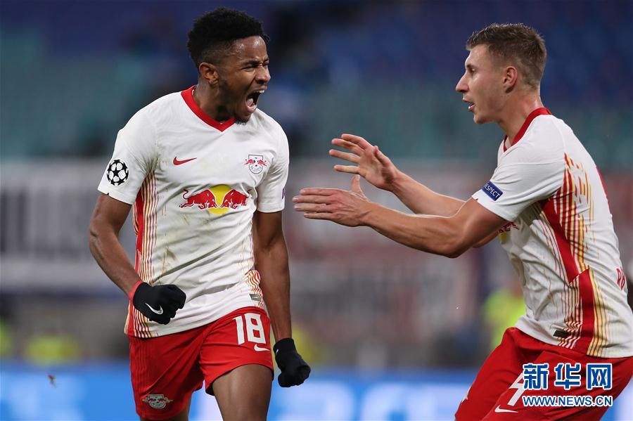 11月4日,莱比锡队球员恩昆库(左)在进球后和队友奥尔班庆祝。 当日,在2020-2021赛季欧冠联赛小组赛H组第三轮比赛中,法甲巴黎圣日耳曼队客场以1比2不敌德甲莱比锡队。 新华社/法新