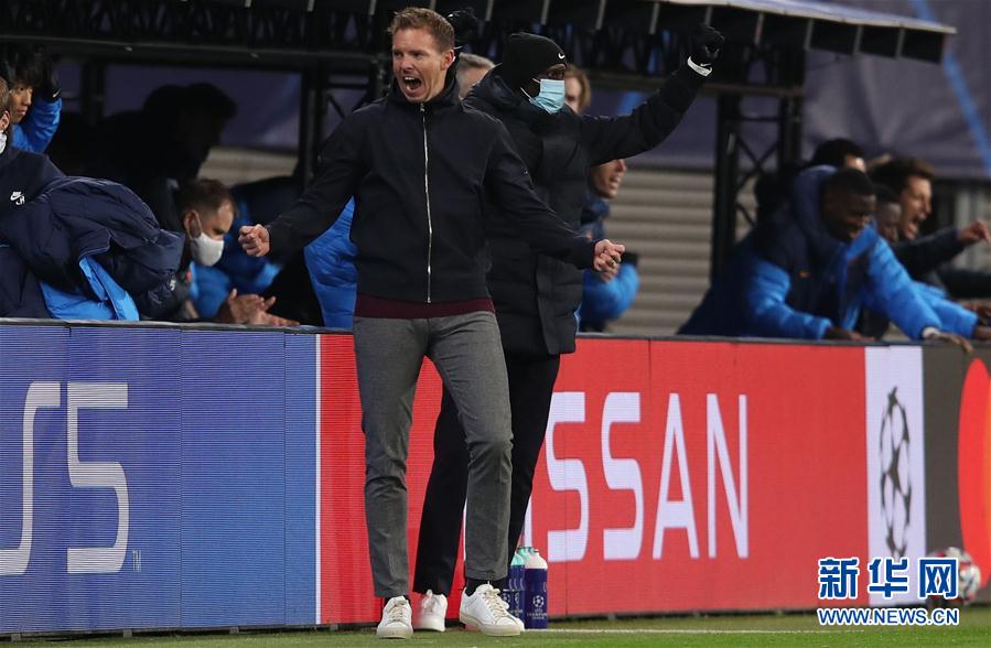 11月4日,莱比锡队主教练纳格尔斯曼(前左)庆祝比赛胜利。 当日,在2020-2021赛季欧冠联赛小组赛H组第三轮比赛中,法甲巴黎圣日耳曼队客场以1比2不敌德甲莱比锡队。 新华社/法新
