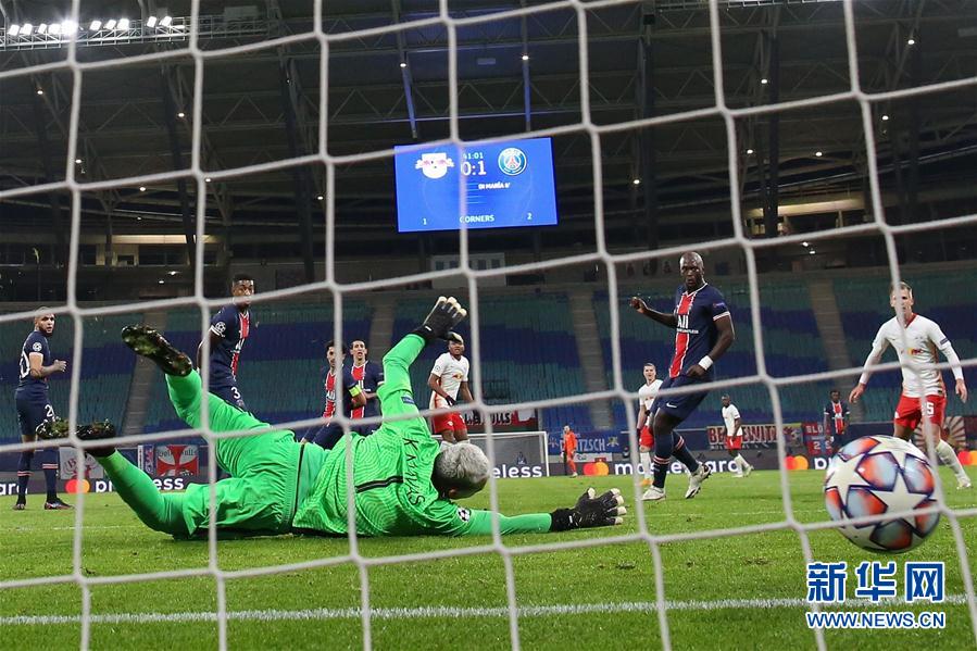 11月4日,巴黎圣日耳曼队守门员纳瓦斯(前)扑救莱比锡队球员恩昆库(左五)的射门失败。 当日,在2020-2021赛季欧冠联赛小组赛H组第三轮比赛中,法甲巴黎圣日耳曼队客场以1比2不敌德甲莱比锡队。 新华社/法新