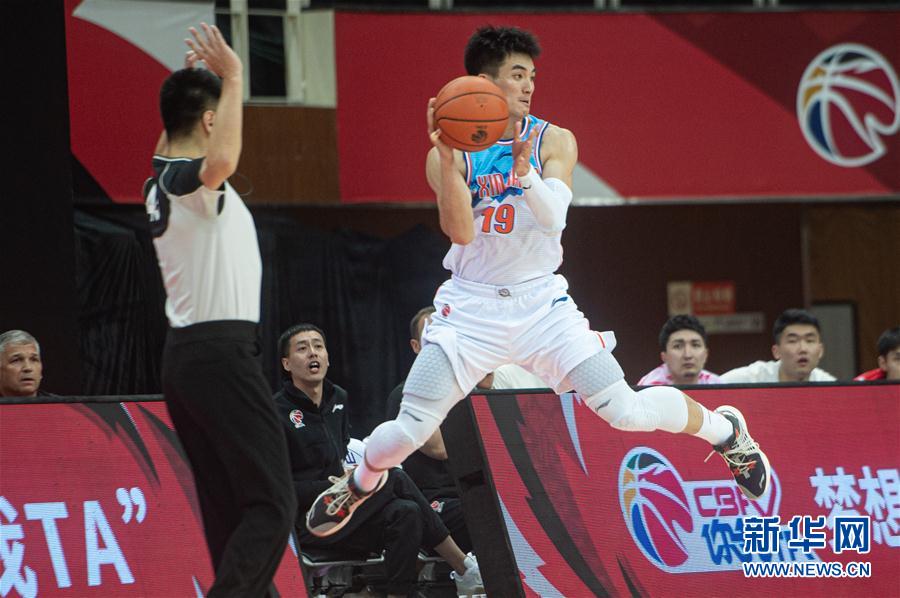 11月4日,新疆伊力特队球员于德豪(右)在比赛中飞身救球。 当日,在浙江诸暨举行的2020-2021赛季中国男子篮球职业联赛(CBA)第一阶段第八轮比赛中,辽宁本钢队以121比108战胜新疆伊力特队。 新华社发(江汉摄)