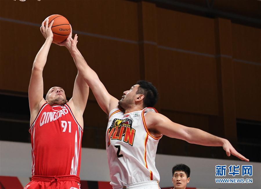 11月4日,青岛国信海天队球员斯蒂马克(左)在九台农商银行队球员钟诚的防守下上篮。 当日,在浙江诸暨举行的2020-2021赛季中国男子篮球职业联赛(CBA)第一阶段第八轮比赛中,青岛国信海天队以84比105不敌九台农商银行队。 新华社记者 沙达提 摄