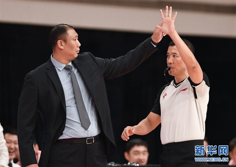 11月4日,本场比赛主裁判韩栩(右)在比赛中。 当日,在浙江诸暨举行的2020-2021赛季中国男子篮球职业联赛(CBA)第一阶段第八轮比赛中,青岛国信海天队以84比105不敌九台农商银行队。 新华社记者 沙达提 摄
